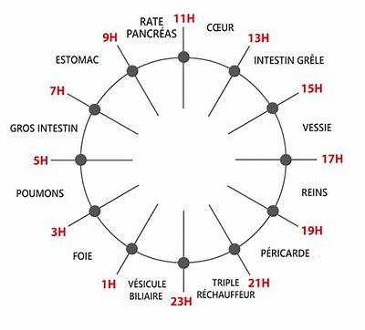 Je vous les donne dans l’ordre de l’horloge circadienne, ou marées énergétiques. Les heures indiquées sont les heures solaires! Prenez en compte les décalages avec les heures légales pour votre calcul d’heure de naissance.