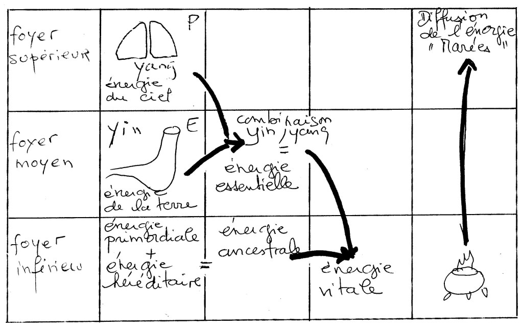– Le triple foyer est le lieu corporel de « fabrication », de répartition, d’assimilation de l’énergie. Il se compose de 3 zones distinctes…