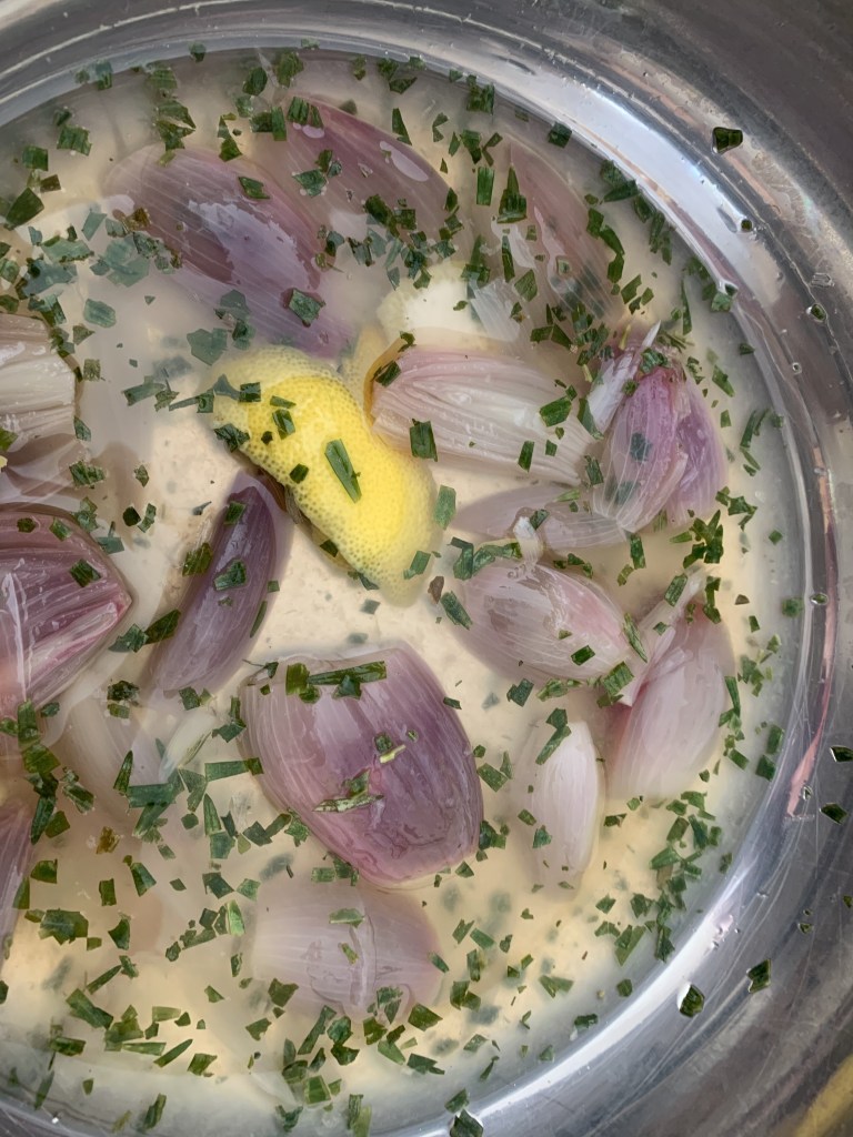 Pendant ce temps, vous aurez épluché et coupé dans la longueur les échalottes. Enchainez leur cuisson après les topinambours. Environ 10 minutes.