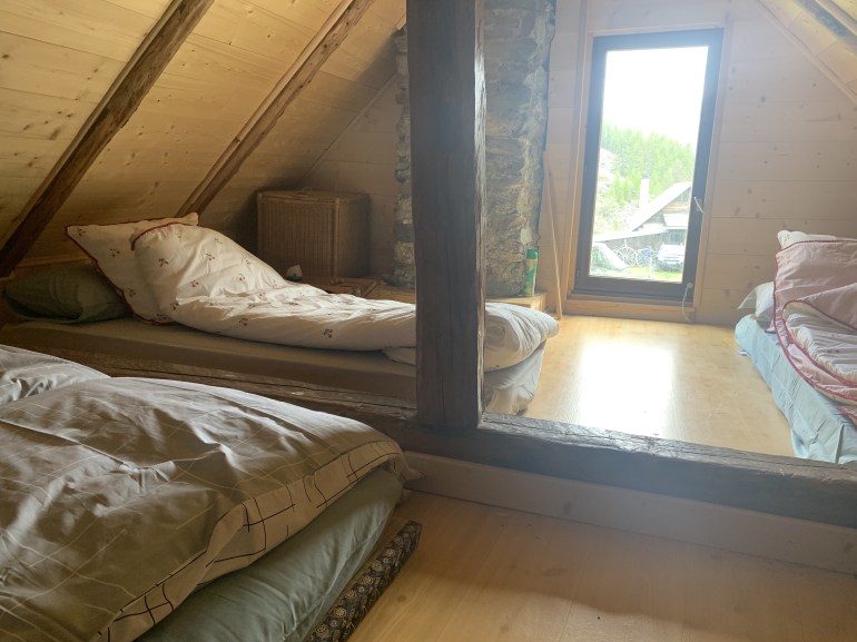 - En sous-pente, accès par échelle meunière, c’est le dortoir. Un grand futon en 160 pour 2 P et 2 matelas 1P. Literie neuve, couettes, oreillers, linge de lit fourni pour la semaine. Linge de toilette non fourni. Bien lumineux, car éclairé par un belle et grande fenêtre donnant sur l’extérieur. Exposition Est, lever du soleil! Une pièce très agréable pouvant aisément faire office de salon, lecture, méditation…
