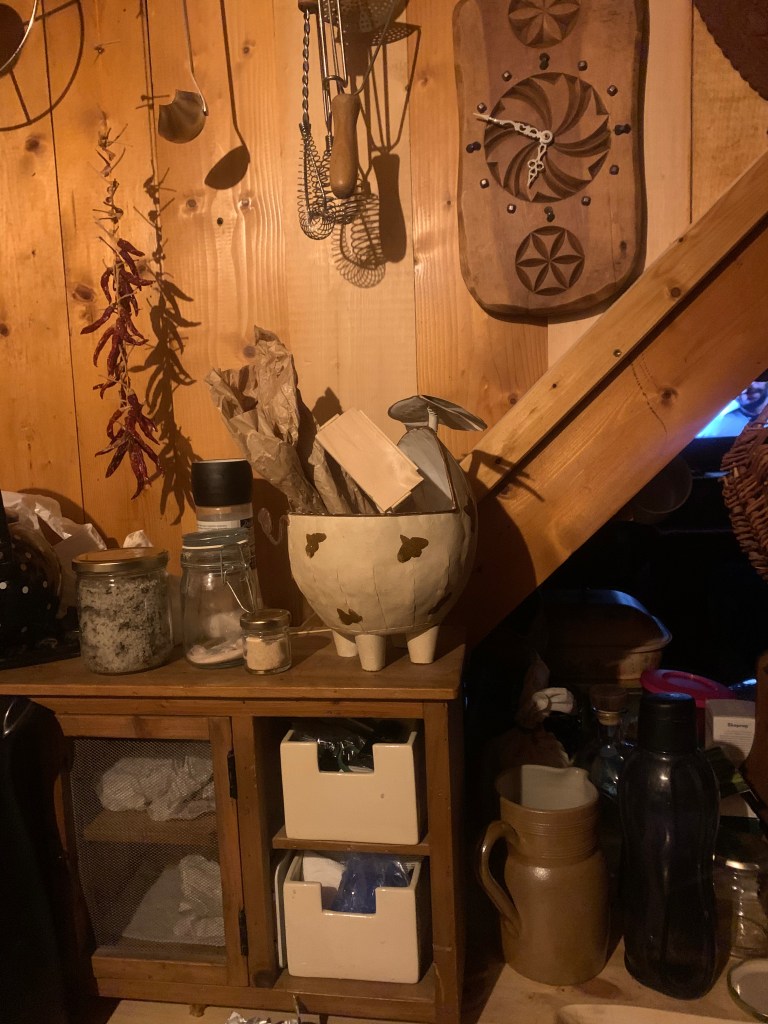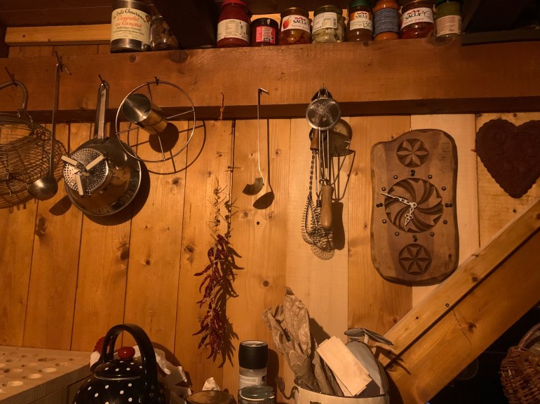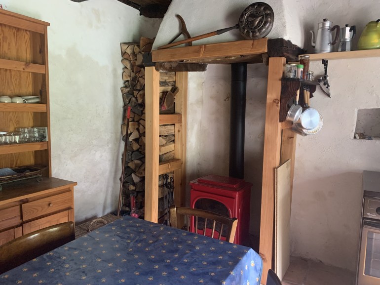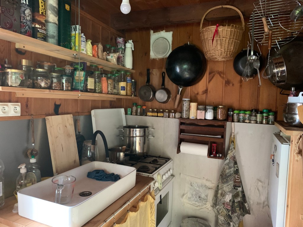 - D’une pièce de vie bien équipée, avec poêle à bois, cuisinière avec four, vaisselle et ustensiles de cuisine, petit garde manger, évier, chauffe-eau alimentant aussi la salle d’eau. Eclairage solaire. Nombreuses étagères où vous pourrez ranger vos affaires, vos provisions, etc…