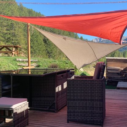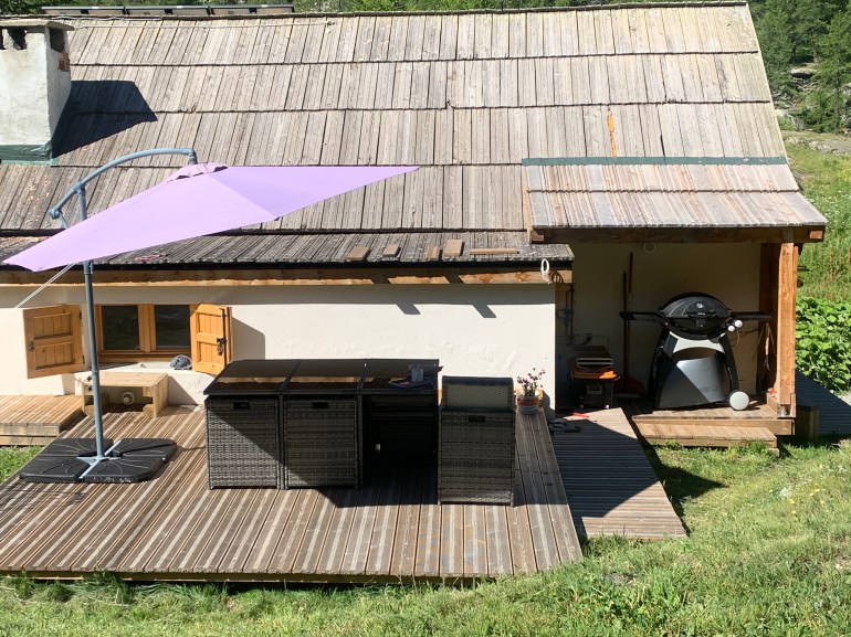 - A l’arrière du chalet, soleil toute la journée, table de jardin et possibilité de barbecue (partagé). Egalement partage possible de la terrasse mélèze avec voiles d’ombrage.