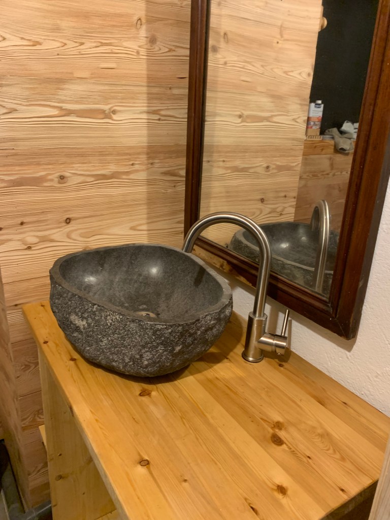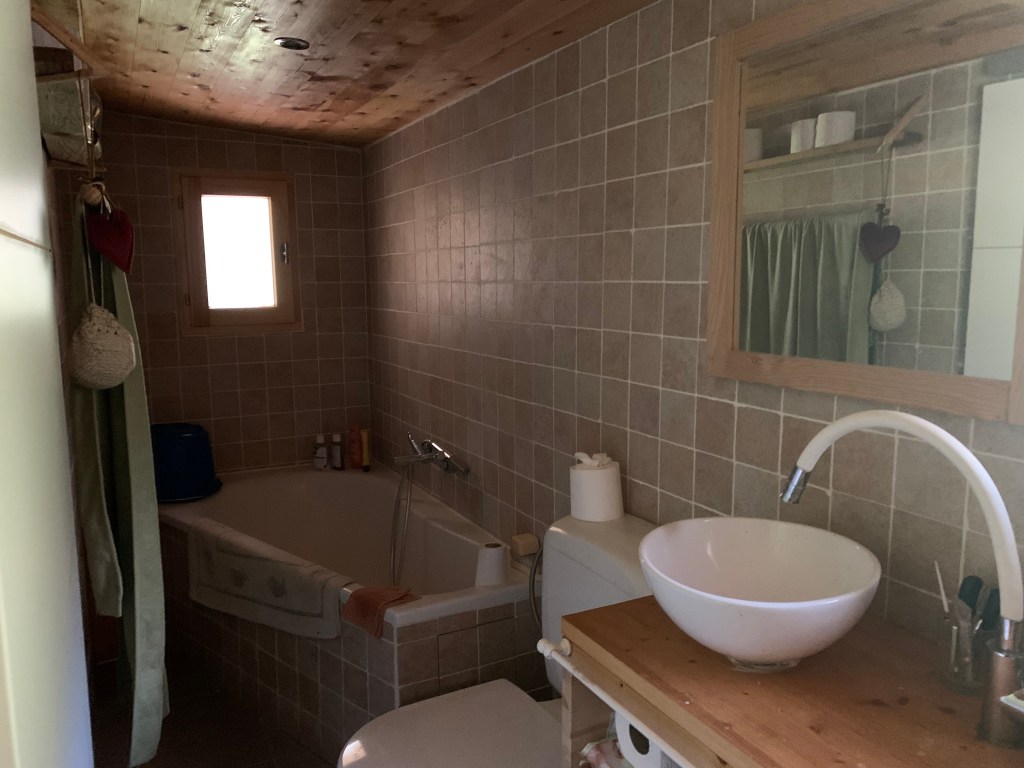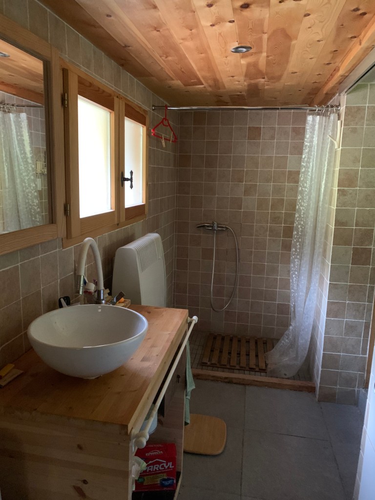- Côté sanitaires, une vraie salle bain, avec douche et wc, le chalet est alimenté à l’eau courante grâce à un captage de source, et au gaz, soyez donc rassurés, vous pourrez prendre une douche à l’eau chaude, enfin, peut-être, car c’est des fois un peu compliqué par ici. Et à condition toutefois de ne pas vouloir la prendre tous au même moment. Comme à la maison quoi! Et si vous préférez profiter de la nature jusqu’au bout, bain douche en pleine nature juste en face, à la cascade!