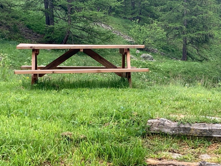 - A l’entrée du chalet, plein sud, petite table et banc…